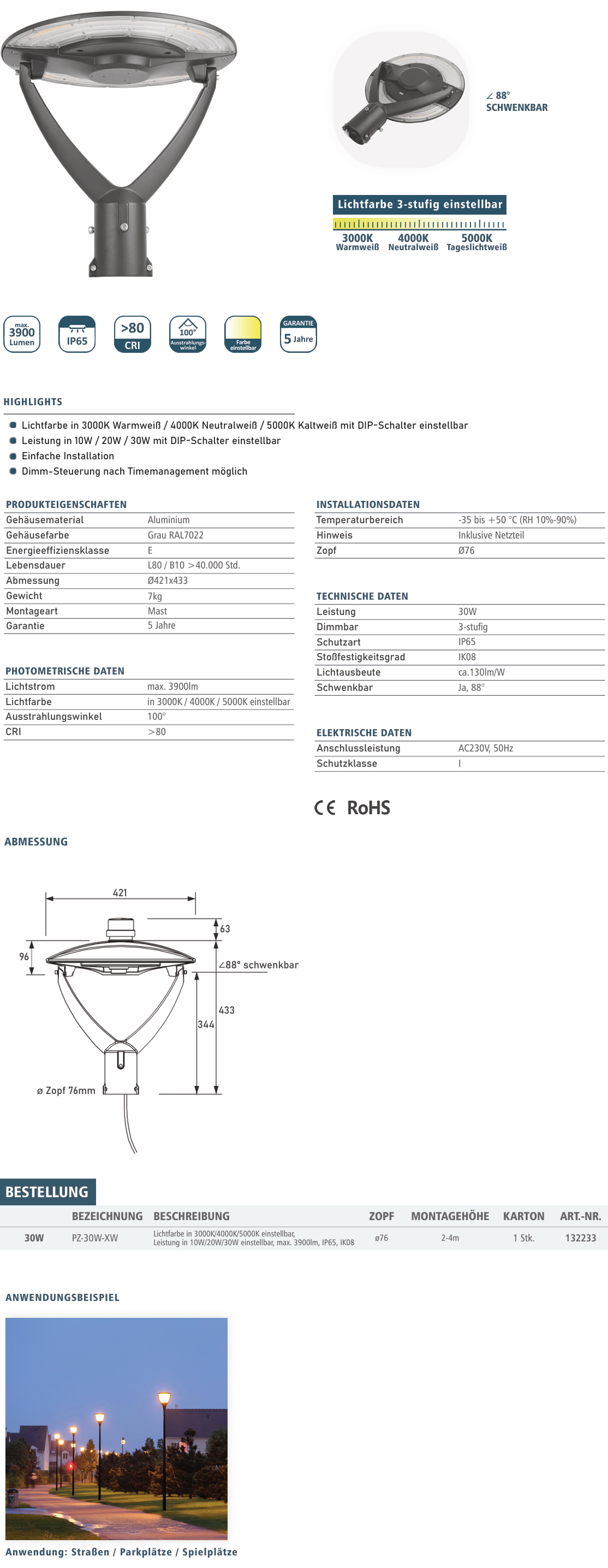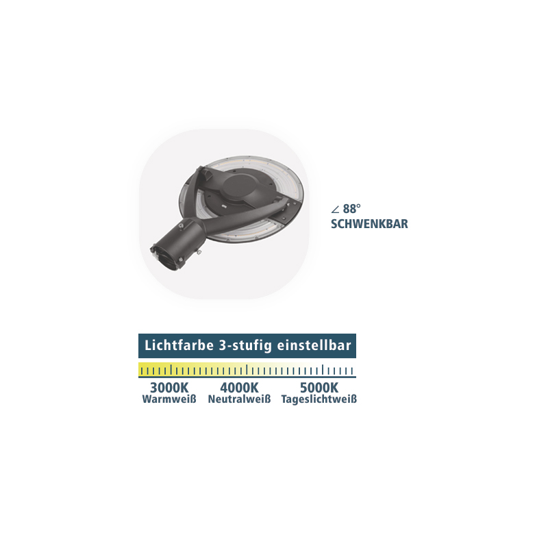 - Lichtfarbe in 3000K Warmweiß / 4000K Neutralweiß / 5000K Kaltweiß mit DIP-Schalter einstellbar