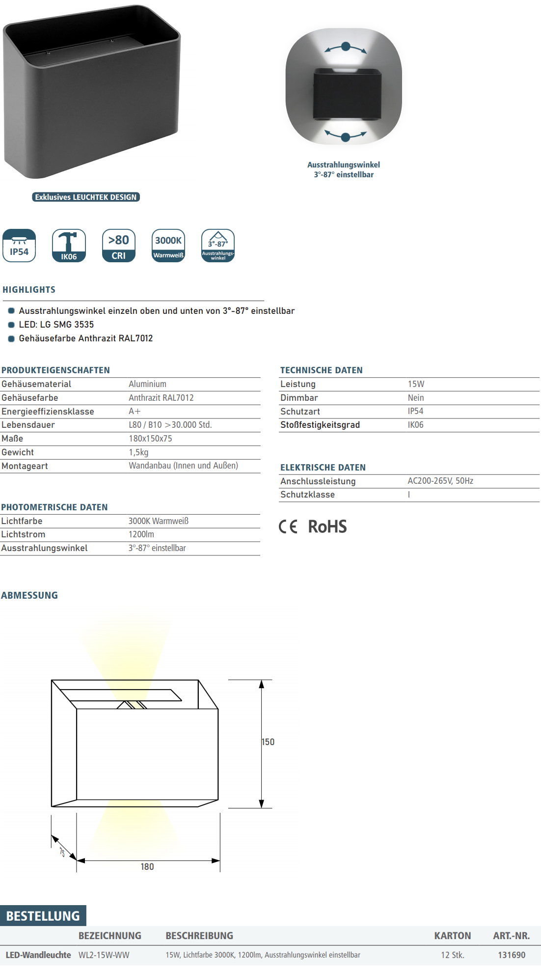 - Abstrahlwinkel: einstellbar (3°-87°)