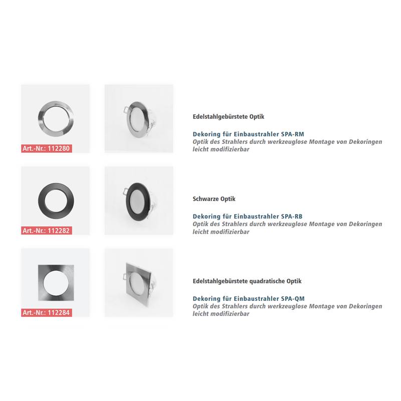 Dekoring für All-in-One Einbaustrahler Serie SPA - Optik des Strahlers durch werkzeuglose Montage von Dekoringen leicht modifizierbar