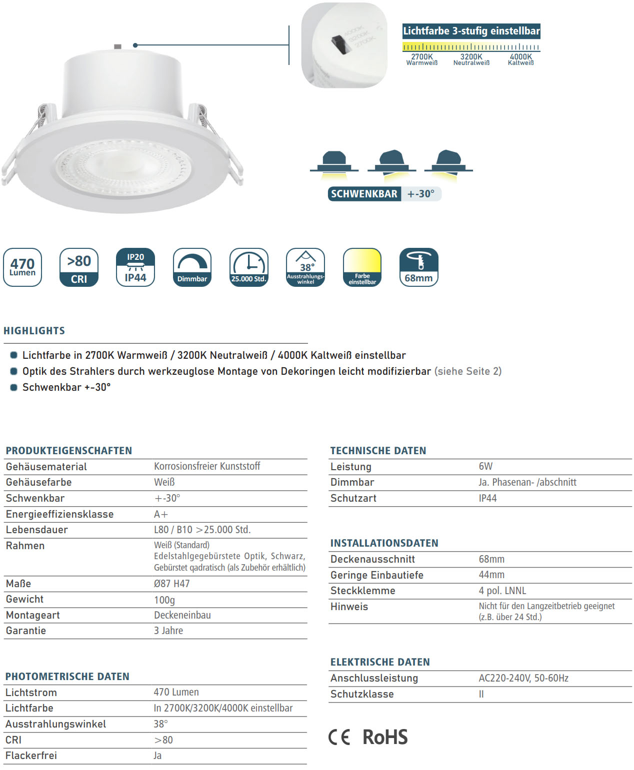 Lichtfarbe | in 2700K/3200K/4000K einstellbar |