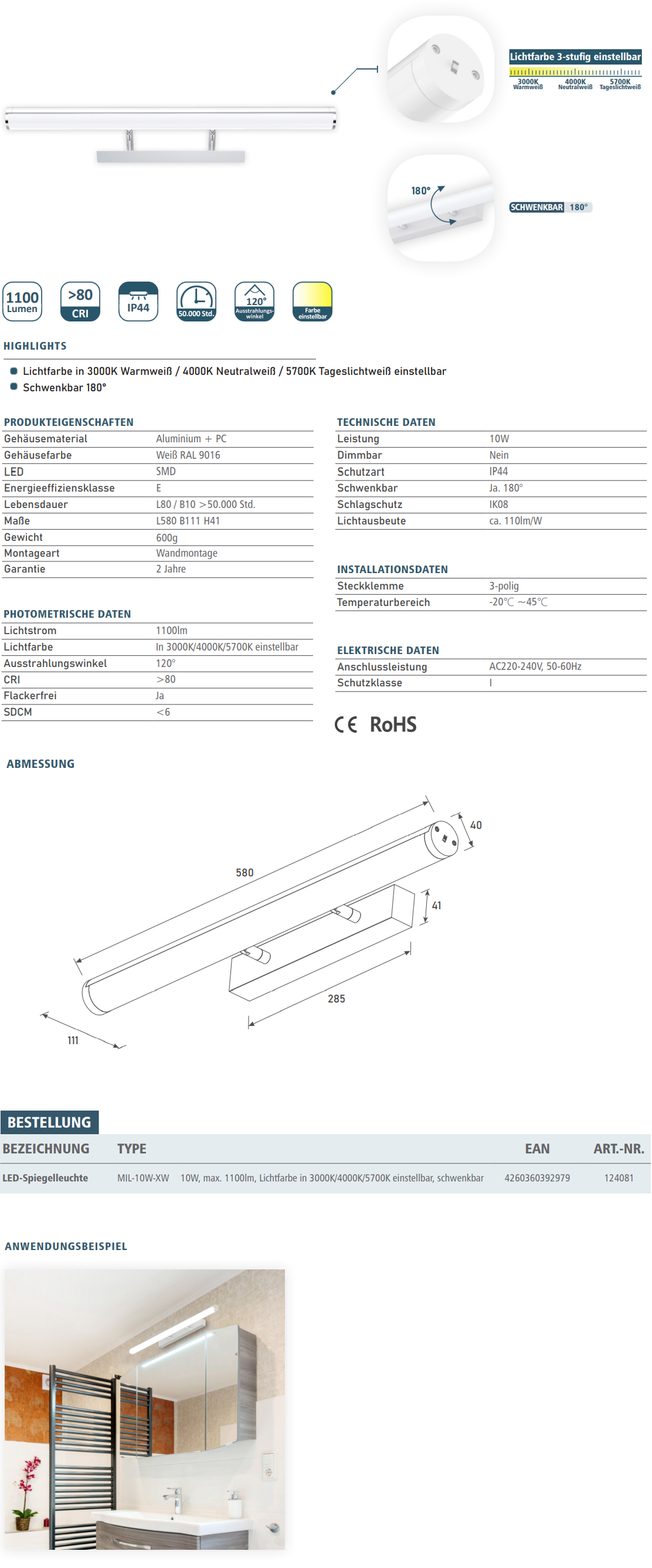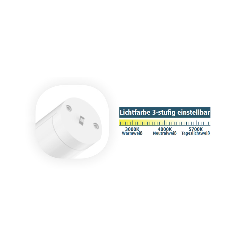 - Lichtfarbe in 3000K Warmweiß / 4000K Neutralweiß / 5700K Tageslichtweiß einstellbar
