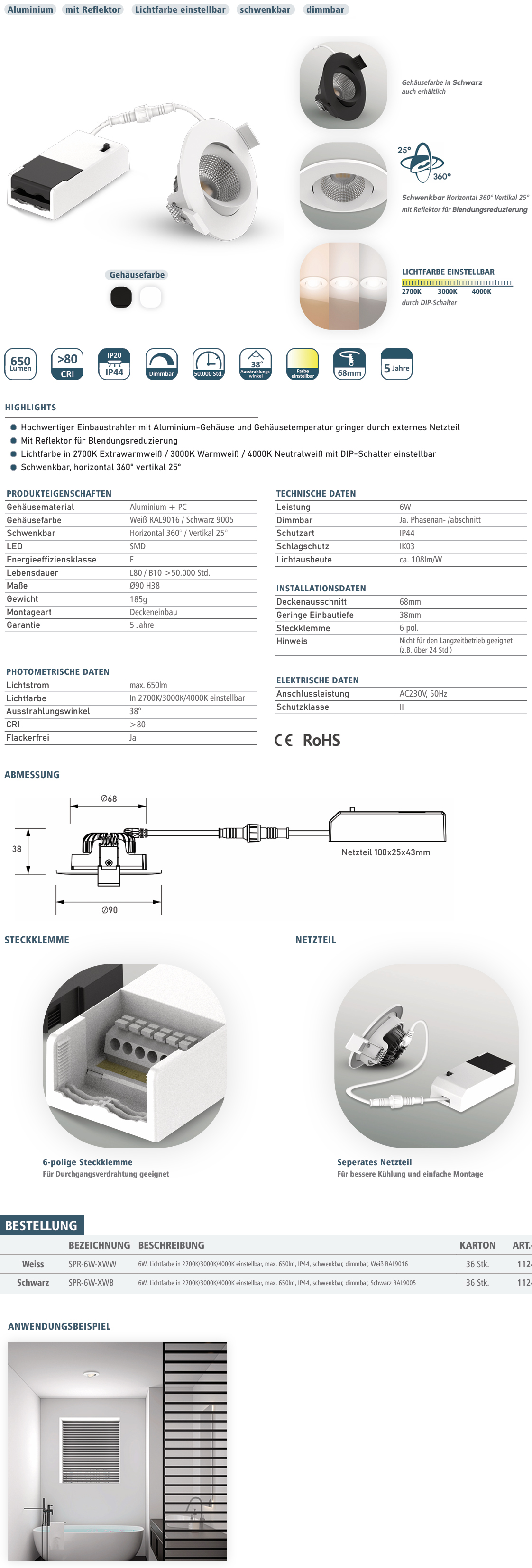 - Lichtfarbe in 2700K Extrawarmweiß / 3000K Warmweiß / 4000K Neutralweiß mit DIP-Schalter einstellbar