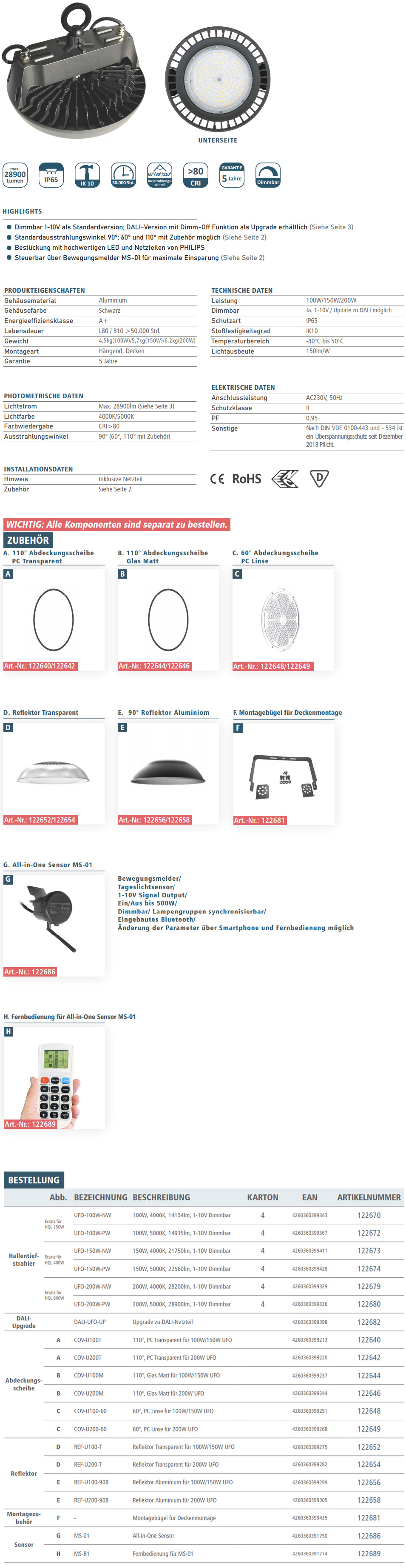 Ersetzt herkömmlich Lampe ca. | 250W /400W HQL |