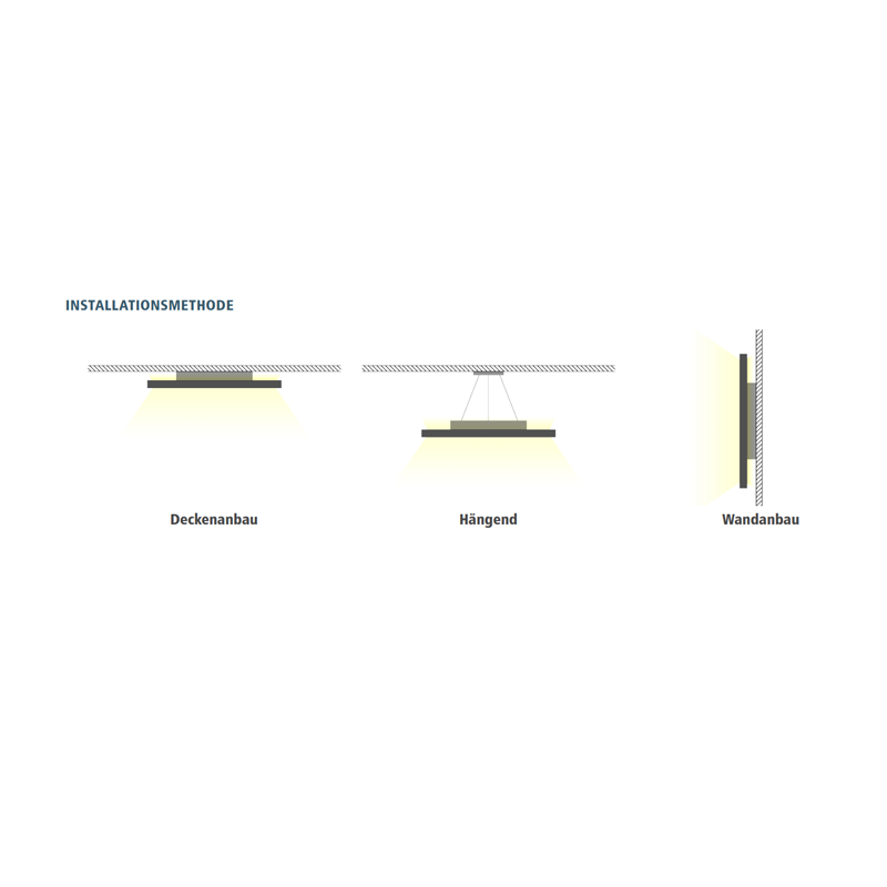 - Montagearten: Deckenanbau, Wandanbau, Hängend
