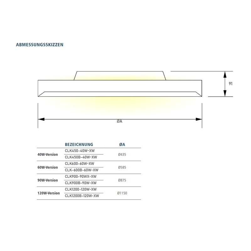 | Abmessung | 40W Ø435x91 / 60W Ø585x91 / 90W Ø875x91 / 120W Ø1150x91 |