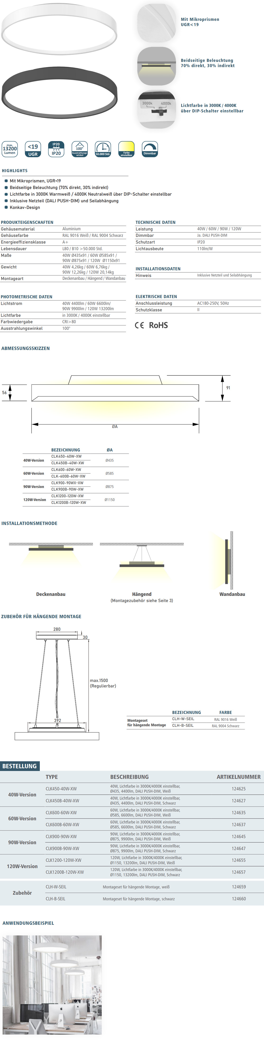 | Abmessung | 40W Ø435x91 / 60W Ø585x91 / 90W Ø875x91 / 120W Ø1150x91 |