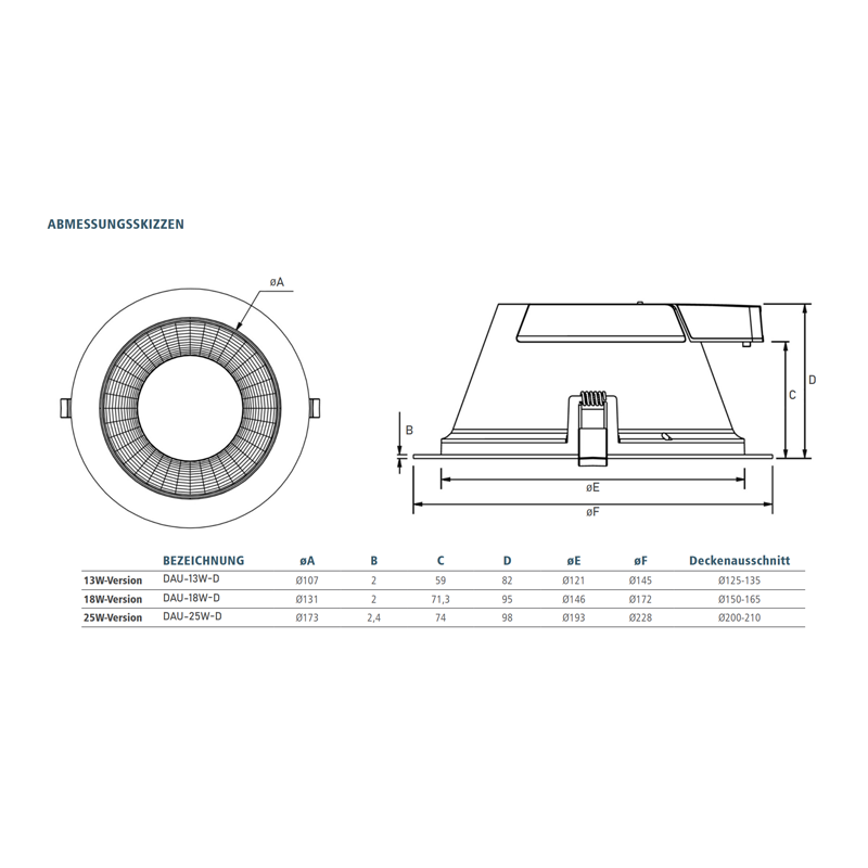 Abmessung | 13W-Version: ø145 H82; 18W-Version: ø172 H95; 25W-Version: ø228 H98 |