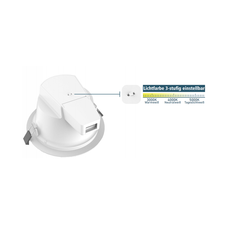 - Lichtfarbe in 3000K Warmweiß / 4000K Neutralweiß / 5000K Tageslichtweiß mit DIP-Schalter einstellbar