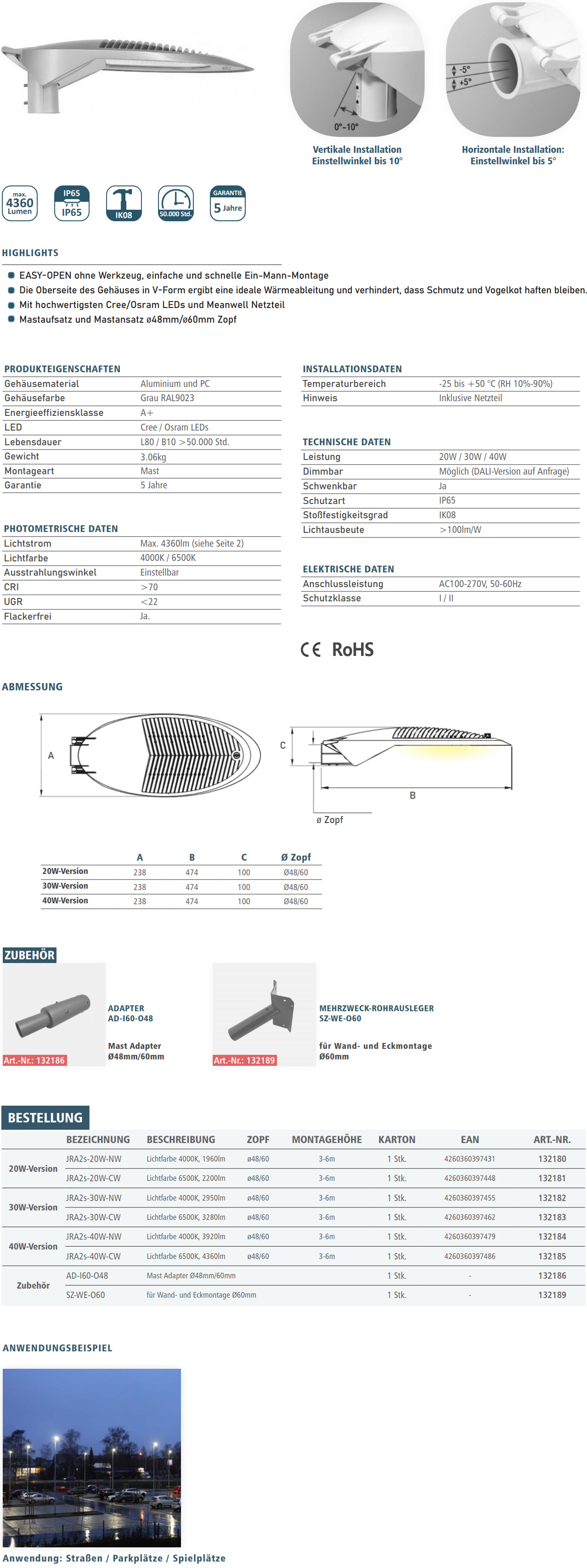 132186 ADAPTER-48/60 Mastadapter ⌀48/⌀60mm 132188 ADAPTER-60/76 Mastadapter ⌀60/⌀76mm 132189 SZ-WE-O60 Mehrzweck-Rohrausleger für Wand- und Eckmontage ⌀60mm